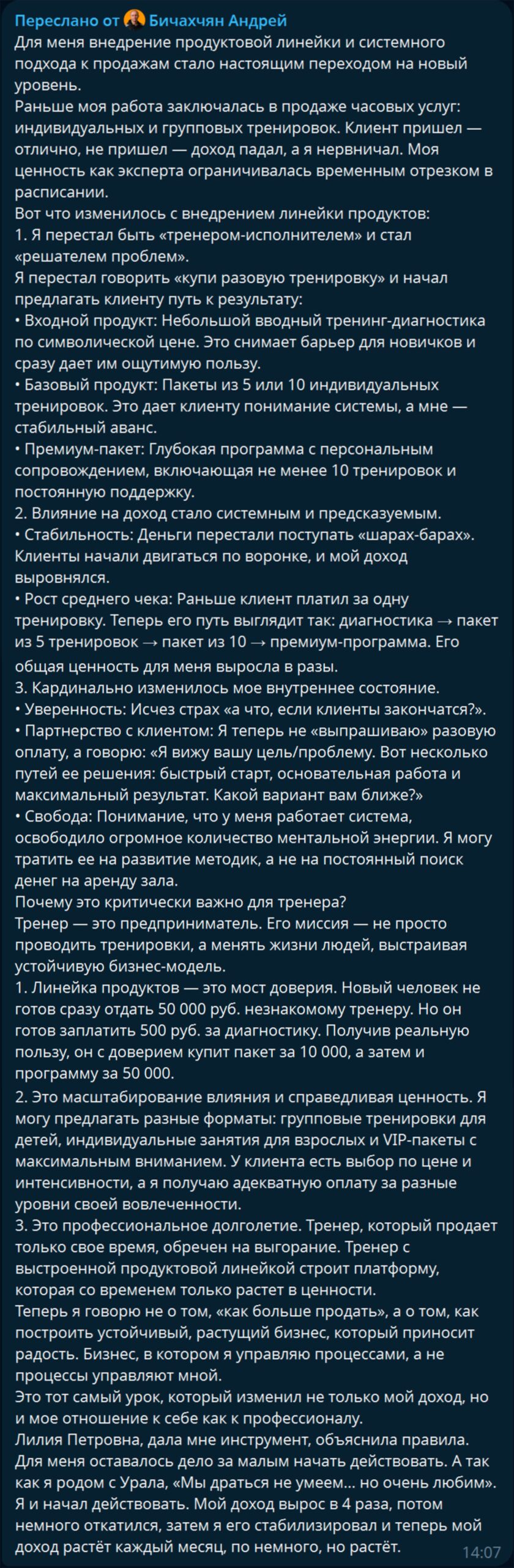 Продуктовая линейка как основа бизнеса Создание разных форматов услуг (от диагностики до премиум-пакетов) позволяет увеличить средний чек в несколько раз, дает клиенту выбор и справедливо оценивает труд тренера.
